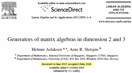 مخاطب عکس بالا دوستانی هستند که در چاپ مقاله بسیار عجله دارند. مقاله بالا 11 سال پس از ارسال به مجله پذیرش گرفته است. البته چاپ مقاله هیچ گاه 11 سال زمان نمی برد. معمولا مجلات علمی جواب نهایی (رد / قبولی مقاله) را طی 1 روز1 تا 6 ماه به نویسنده اطلاع می دهند.