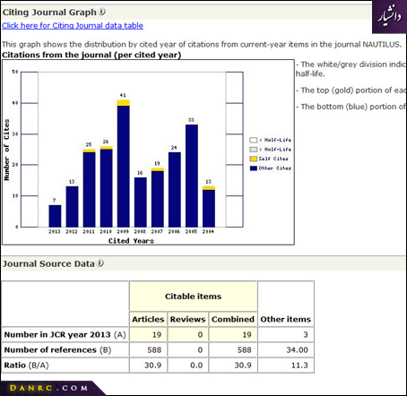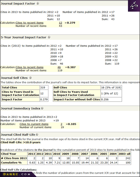از اطلاعات دیگری که از طریق JCR می توان بدست آورد نحوه محاسبه ضریب تاثیر است (تصویر 5). اطلاعات این بخش نشان می دهد که این مجله در طول دو سال 43 مقاله و در طول 5 سال 119 مقاله چاپ کرده است.