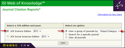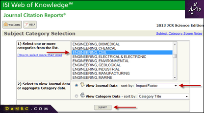 جهت انتخاب مجله به صفحه اصلی JCR مراجعه نمایید. اطلاعات این صفحه را مانند تصویر 1 تنظیم نمایید و سپس برروی Submit کلیک کنید.
