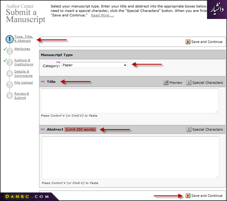 همانطور که در تصویر 4 قابل مشاهده است روند ثبت نام شش مرحله دارد.در مرحله اول باید نوع مقاله را مشخص کنید. همچنین عنوان مقاله و چکیده را نیز وارد کنید و با کلیک بر روی "ذخیره و ادامه" به مرحله دوم ثبت نام بروید.