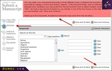 پیشنهاد من این است که از کلمات کلیدی که به روش جستجو و لیست انتخاب می شود استفاده نمایید زیرا در بسیاری از موارد کلمات کلیدی که توسط نویسندگان انتخاب می شود مناسب نیست. پس از وارد کردن اطلاعات به مرحله بعد بروید.