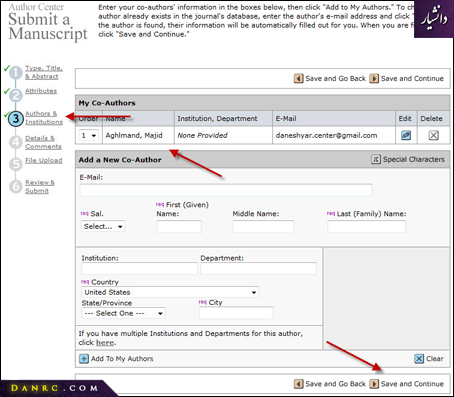 به بخش مربوط به نویسنده مسئول بروید (تصویر 2- فلش قرمز).