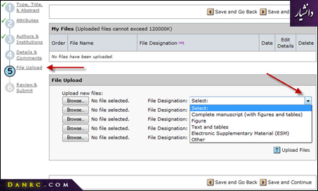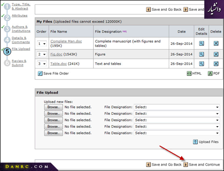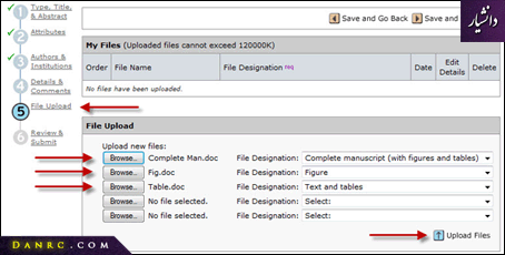 در مرحله 5 (تصویر 8) باید فایل های مربوط به مقاله را در سیستم ضمیمه نمایید. فایل اول مربوط به مقاله است، که باید همراه با نمودار ها/تصاویر و جدول باشد. فایل دوم مربوط به نمودار ها/تصاویر است و فایل سوم مربوط به جدول ها.