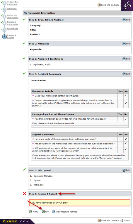 با مشاهده فایل PDF تیک قرمز رنگی که کنار مرحله 6 قرار داشت به تیک تایید سبز رنگ تبدیل می شود. در صورت تایید موارد ثبت نام بر روی Submit کلیک کنید (تصویر 16). سپس در پنجره ای که باز می شود (تصویر 17) بر روی OK کلیک کنید. به اینصورت ثبت نام شما نهایی شده و مقاله به دفتر مجله ارسال می گردد.