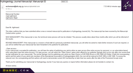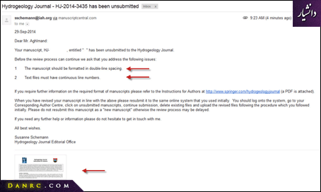 مقاله شما توسط مجله بررسی می شود. در صورتیکه تمامی موارد را درست انجام داده باشید، مقاله وارد مرحله داوری می شود. در صورتیکه مقاله براساس فرمت مجله تنظیم نشده باشد ایمیلی از سوی مجله دریافت خواهید کرد. در این ایمیل مواردی که نیاز به اصلاح و ویرایش دارد ذکر شده است (تصویر 20).